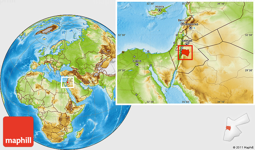 Maphill is a collection of map images. This image combines a physical map with the globe centered on Karak. Use the buttons under the image to switch to different map types.