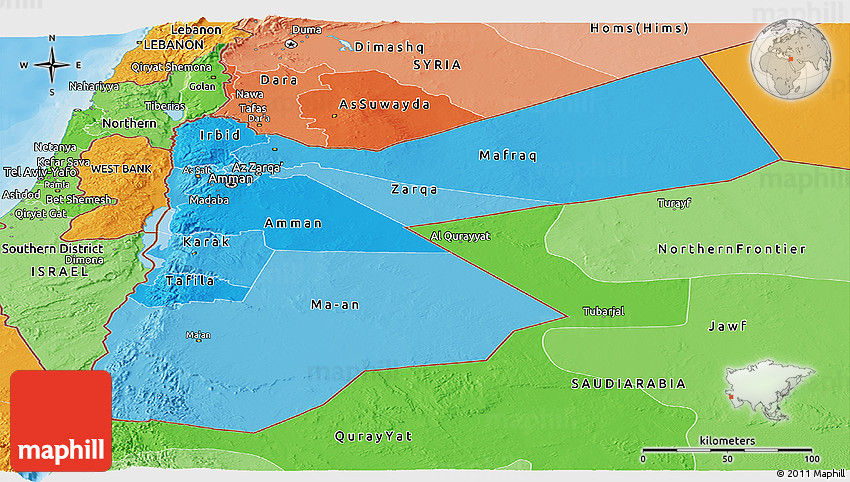The panoramic political shades map represents one of many map types and styles available. Look at Jordan from different perspectives.