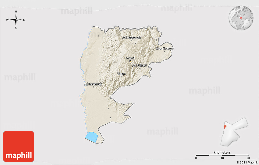 Shaded relief map shows landscape features, such as mountains, valleys and plateaus. Flat areas are smooth on the map, areas with steep slopes and mountains appear more rough. The above map of Salt (Balqa) was created using a digital elevation model.