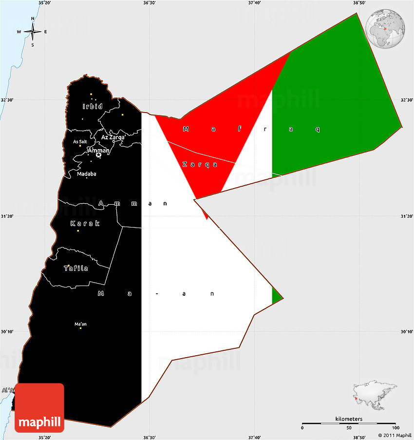 Flag map shows the flag of Jordan clipped inside the country's borders. Flag image is resized to match the width and height of the country's outline. Maphill flag maps are more precise than often used flag clip art illustrations.