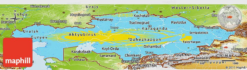 The value of Maphill lies in the possibility to look at the same area from several perspectives. Maphill presents the map of Kazakhstan in a wide variety of map types and styles.