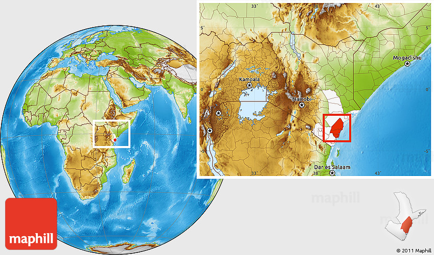 Maphill is a collection of map images. This image combines a physical map with the globe centered on KILIFI. Use the buttons under the image to switch to different map types.