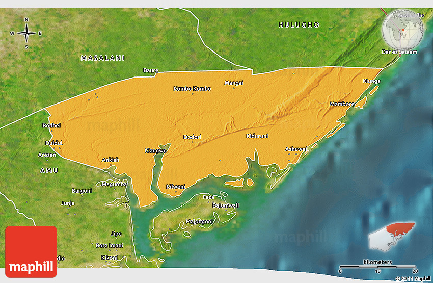 Satellite map shows the Earth's surface as it really looks like. The above map is based on satellite images taken on July 2004. This satellite map of KIUNGA is meant for illustration purposes only. For more detailed maps based on newer satellite and aerial images switch to a detailed map view.