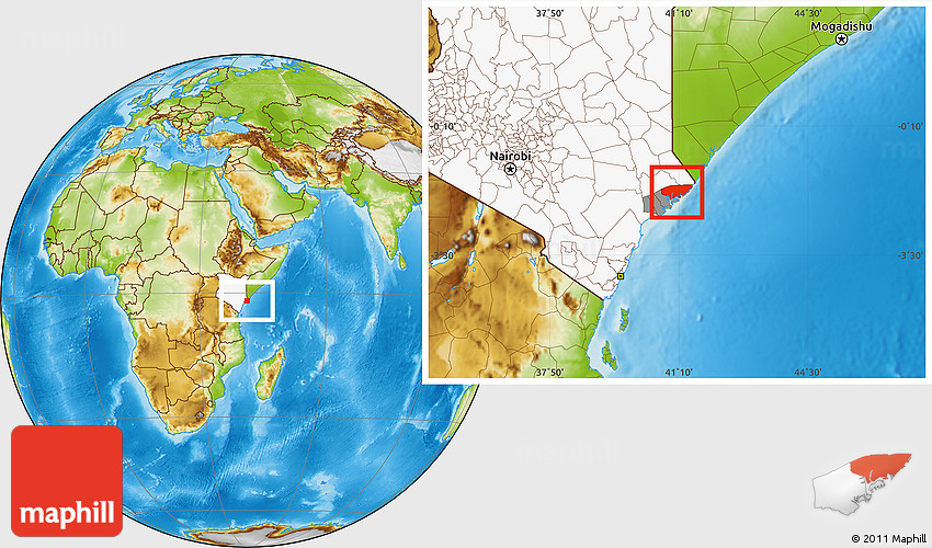 Maphill is a collection of map images. This image combines a physical map with the globe centered on KIUNGA. Use the buttons under the image to switch to different map types.