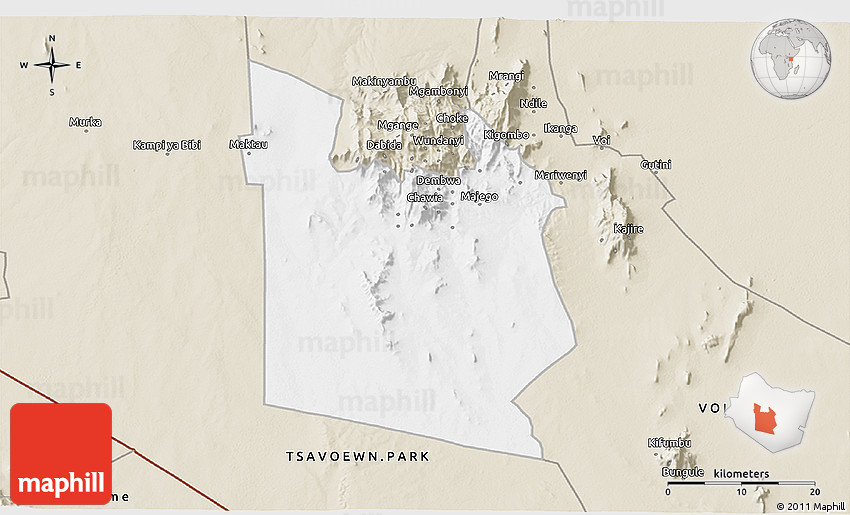 The 3D classic style map represents one of several map types available. Look at MWATATE, TAITA TAVETA, COAST, Kenya from different perspectives.