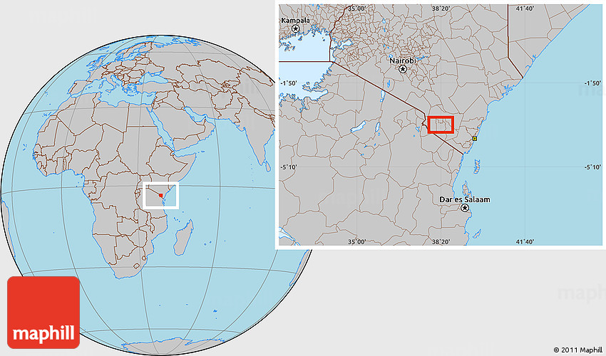 Maphill is a collection of map images. This image combines a gray map with the globe centered on Mrugua. Use the buttons under the image to switch to different map types.