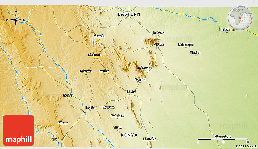 The 3D physical map represents one of many map types and styles available. Look at Nguuni, MUTOMO, KITUI, EASTERN, Kenya from different perspectives.