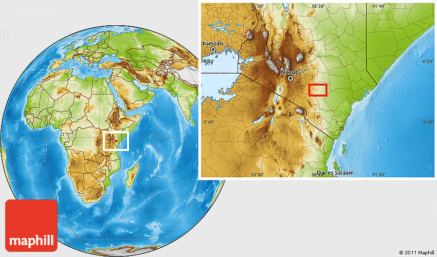 Maphill is a collection of map images. This image combines a physical map with the globe centered on Ngwate. Use the buttons under the image to switch to different map types.