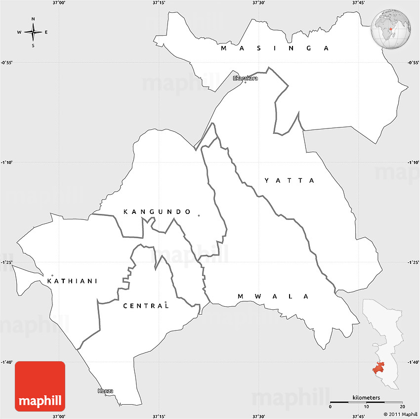 The simple silver style outline map represents one of several map types and styles available. Look at MACHAKOS, EASTERN, Kenya from different perspectives.