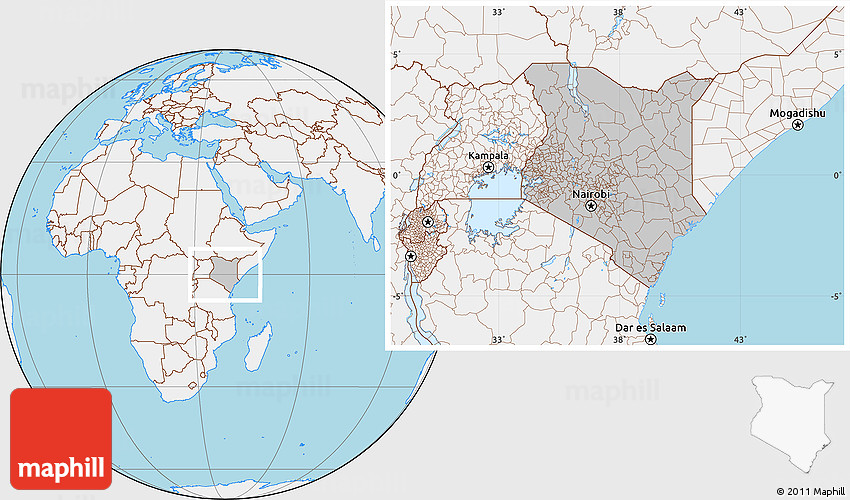 Maphill is a collection of map images. This image combines a gray map with the globe centered on Kenya. Use the buttons under the image to switch to different map types.