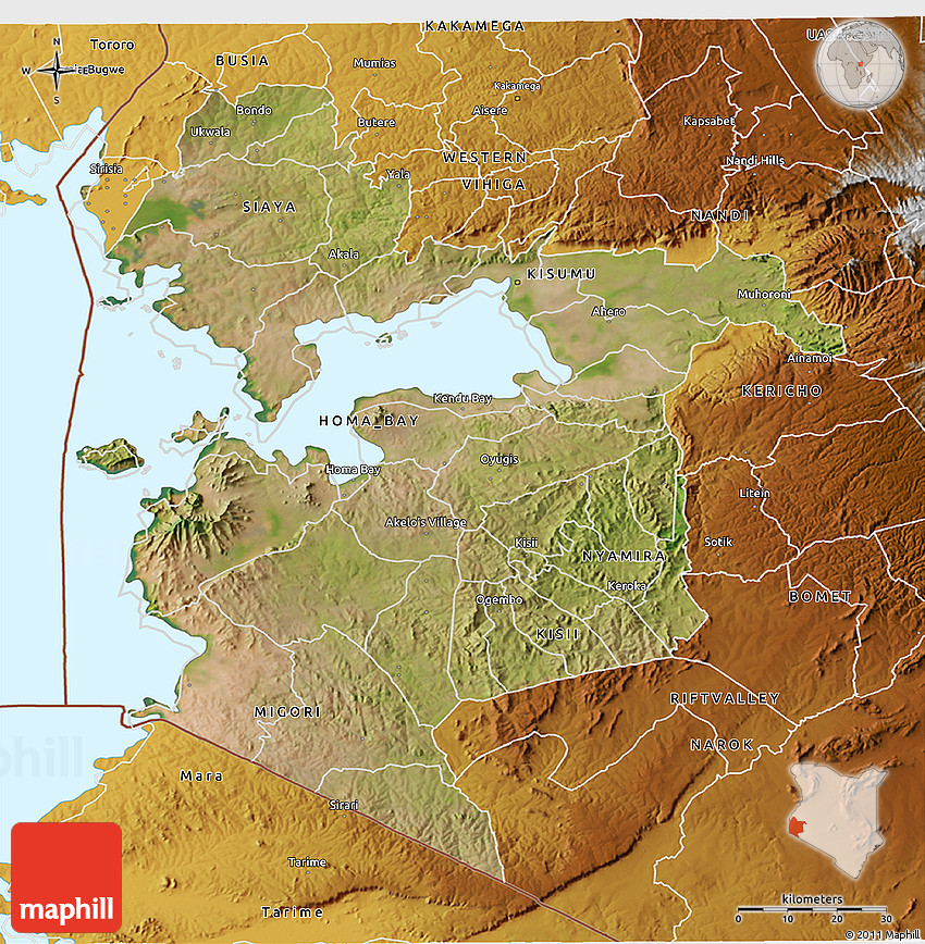 Maphill is a collection of map images. This view of NYANZA at an angle of 60° is one of these images. Click on the Detailed button under the map for a more comprehensive map.