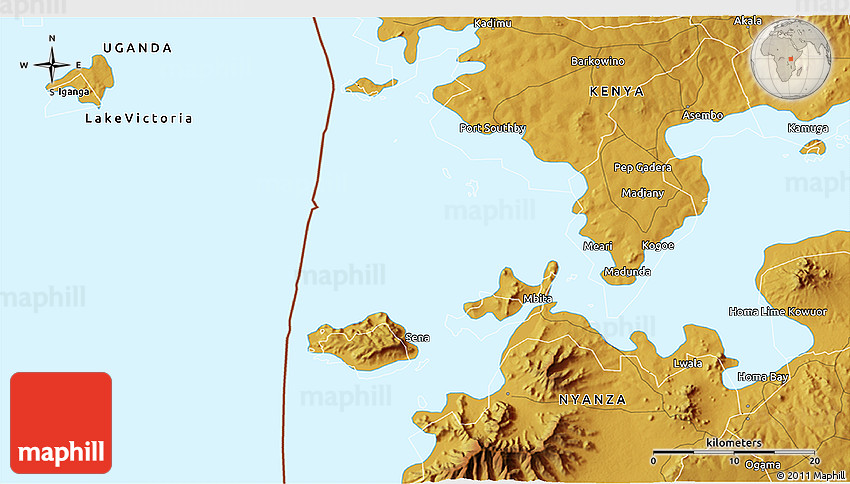 The 3D physical map represents one of many map types and styles available. Look at Sindo, MBITA, HOMA_BAY, NYANZA, Kenya from different perspectives.