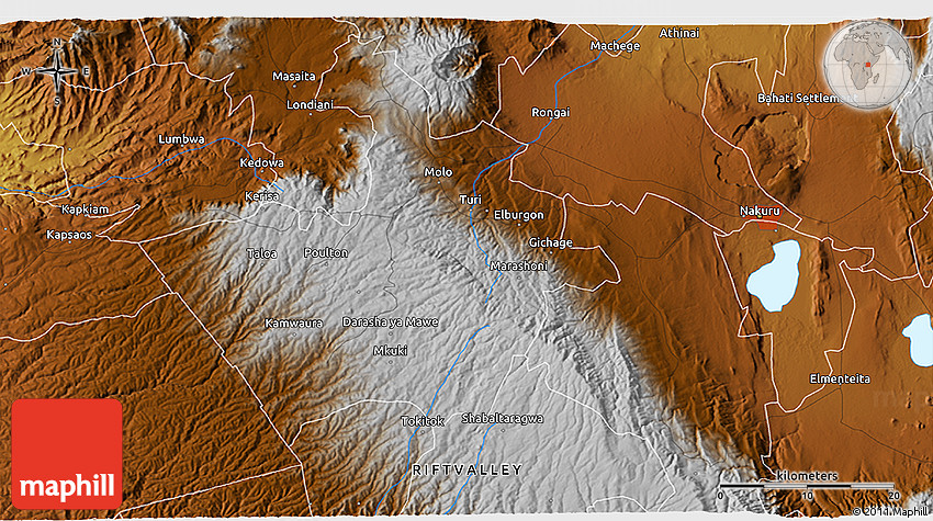 The 3D physical map represents one of many map types and styles available. Look at Gichage, MOLO, NAKURU, RIFT VALLEY, Kenya from different perspectives.