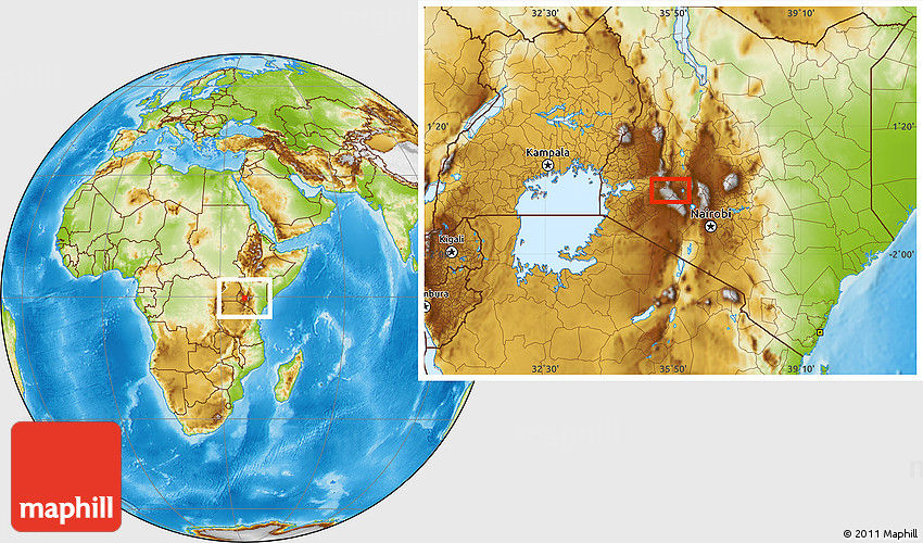 Maphill is a collection of map images. This image combines a physical map with the globe centered on Mkuki. Use the buttons under the image to switch to different map types.