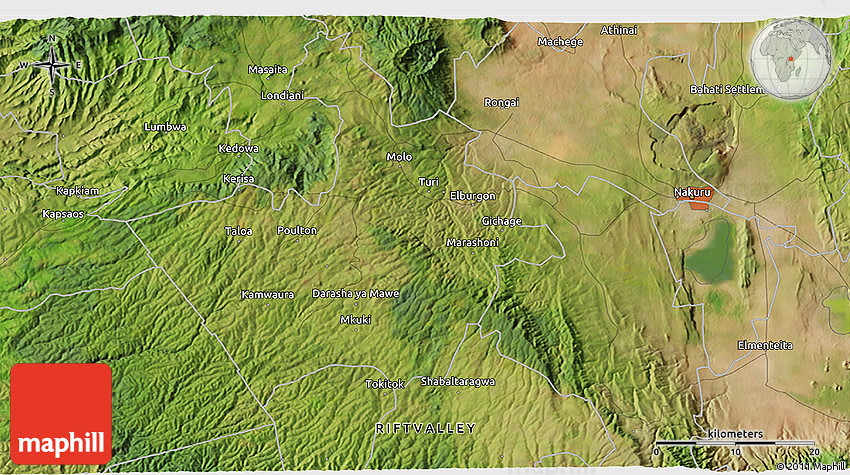 The 3D satellite map represents one of many map types and styles available. Look at Turi, MOLO, NAKURU, RIFT VALLEY, Kenya from different perspectives.