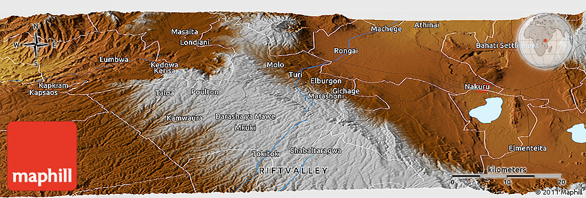 The panoramic physical map represents one of many map types and styles available. Look at Waterer, MOLO, NAKURU, RIFT VALLEY, Kenya from different perspectives.