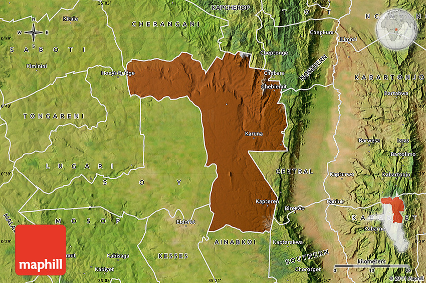 The flat physical map represents one of several map types available. Look at MOIBEN, UASIN GISHU, RIFT VALLEY, Kenya from different perspectives.