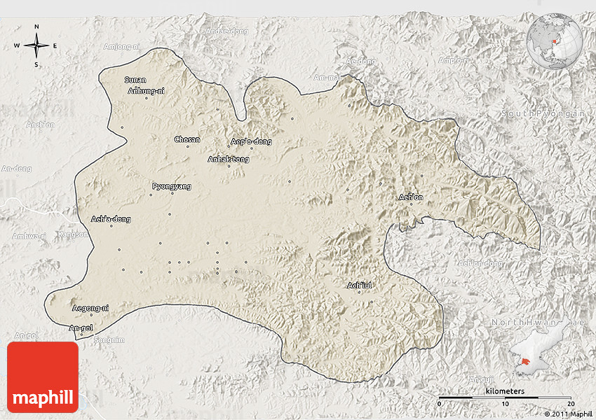 Shaded relief map shows landscape features, such as mountains, valleys and plateaus. Flat areas are smooth on the map, areas with steep slopes and mountains appear more rough. The above map of Pyongyang was created using a digital elevation model.