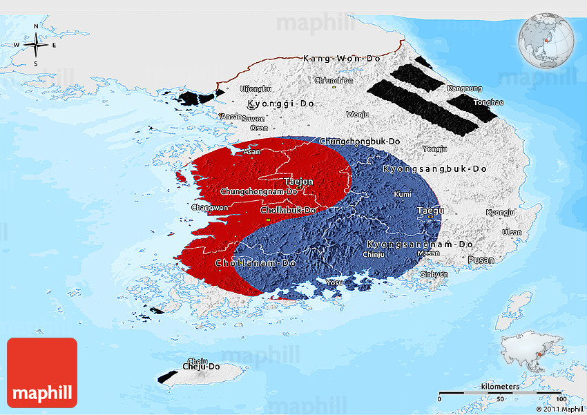 Flag map shows the flag of South Korea clipped inside the country's borders. Flag image is resized to match the width and height of the country's outline. Maphill flag maps are more precise than often used flag clip art illustrations.