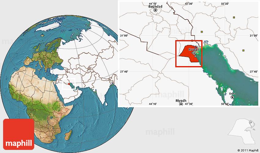 Maphill is a collection of map images. This image combines a satellite map with the globe centered on Kuwait. Use the buttons under the image to switch to different map types.