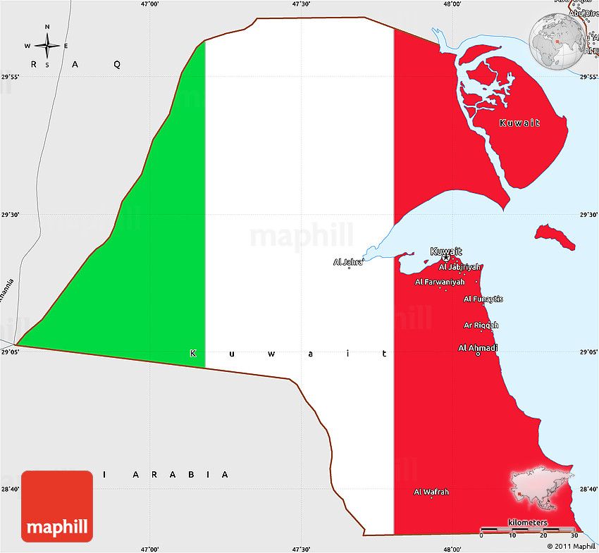 Flag map shows the flag of Kuwait clipped inside the country's borders. Flag image is resized to match the width and height of the country's outline. Maphill flag maps are more precise than often used flag clip art illustrations.
