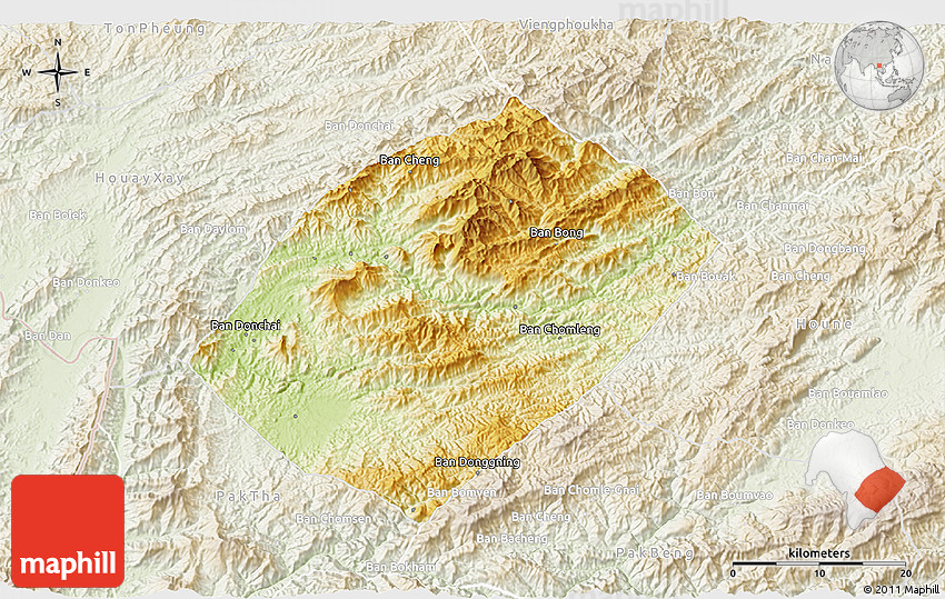The 3D physical map represents one of several map types and styles available. Look at Pha Oudom, Bokeo, Laos from different perspectives.