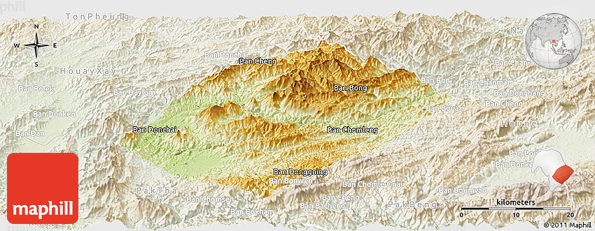 The panoramic physical map represents one of several map types and styles available. Look at Pha Oudom, Bokeo, Laos from different perspectives.
