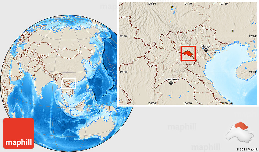 Maphill is a collection of map images. This image combines a shaded relief map with the globe centered on Xiengkho. Use the buttons under the image to switch to different map types.