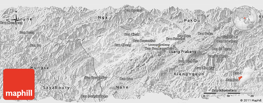 The panoramic silver style map represents one of several map types and styles available. Look at Chomphet, Luang Prabang, Laos from different perspectives.
