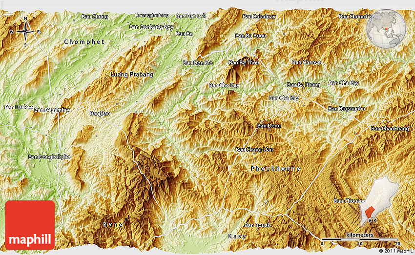 The 3D physical map represents one of several map types and styles available. Look at Xiengngeun, Luang Prabang, Laos from different perspectives.