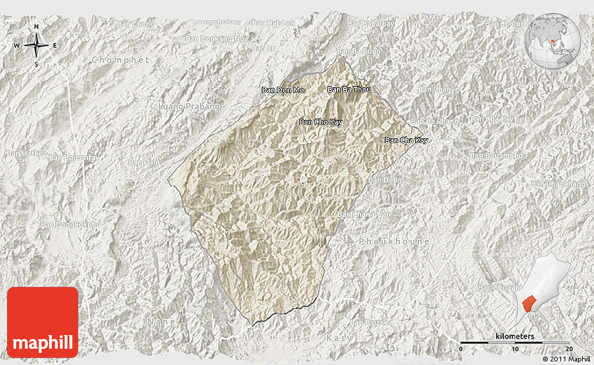 Shaded relief map shows landscape features, such as mountains, valleys and plateaus. Flat areas are smooth on the map, areas with steep slopes and mountains appear more rough. The above map of Xiengngeun was created using a digital elevation model.