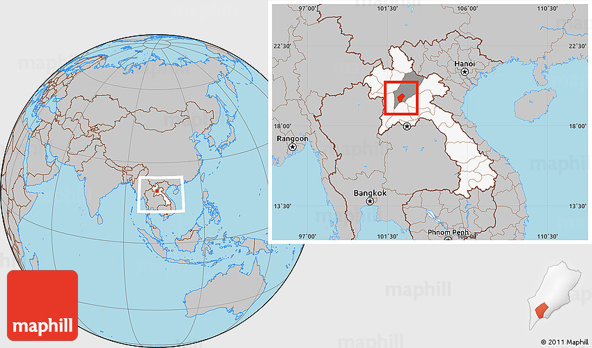 Each map type offers different information and each map style is designed for a different purpose. Read about the styles and map projection used in the above map (Gray Location Map of Xiengngeun, highlighted country, highlighted parent region, within the entire country).