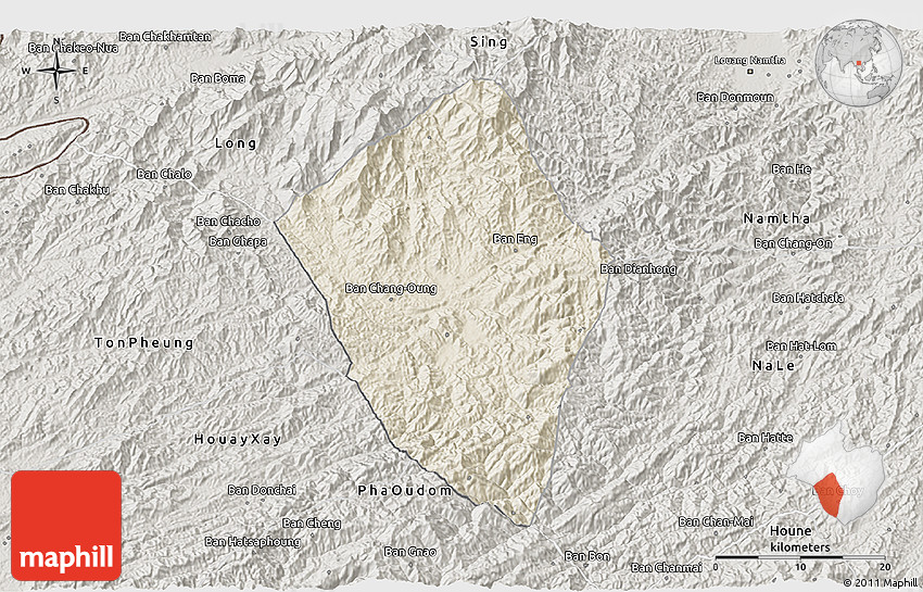 Shaded relief map shows landscape features, such as mountains, valleys and plateaus. Flat areas are smooth on the map, areas with steep slopes and mountains appear more rough. The above map of Viengphoukha was created using a digital elevation model.