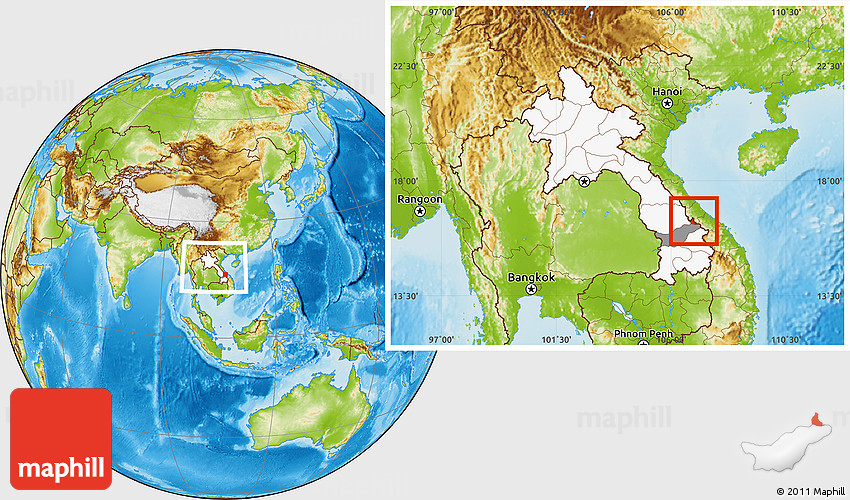 Maphill is a collection of map images. This image combines a physical map with the globe centered on Sa Mouay. Use the buttons under the image to switch to different map types.