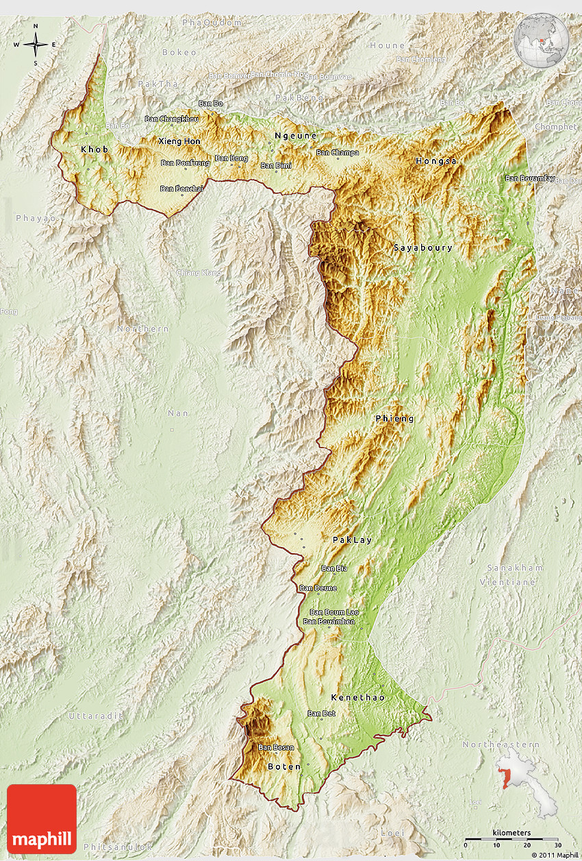 Physical map illustrates the mountains, lowlands, oceans, lakes and rivers and other physical landscape features of Sayabouri. Differences in land elevations relative to the sea level are represented by color.