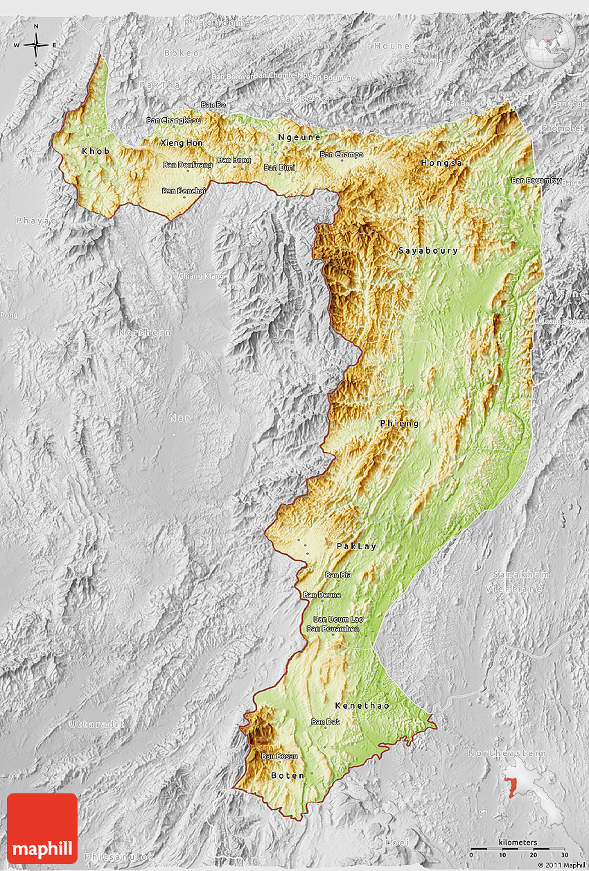 Physical map illustrates the mountains, lowlands, oceans, lakes and rivers and other physical landscape features of Sayabouri. Differences in land elevations relative to the sea level are represented by color.