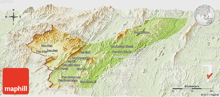 The panoramic physical map represents one of several map types and styles available. Look at Pak Lay, Sayabouri, Laos from different perspectives.