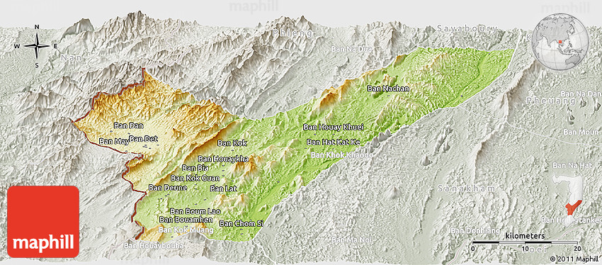 The panoramic physical map represents one of several map types and styles available. Look at Pak Lay, Sayabouri, Laos from different perspectives.