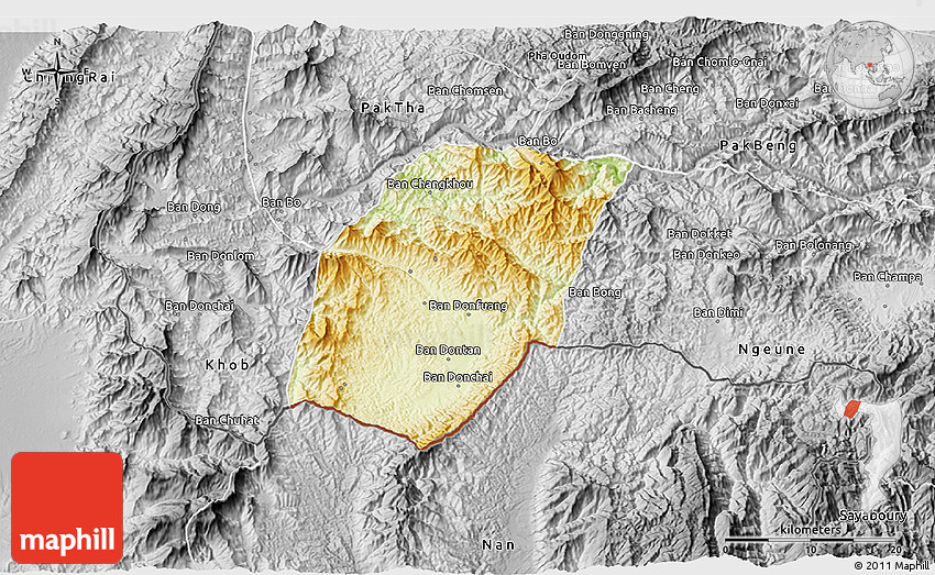 The 3D physical map represents one of several map types and styles available. Look at Xieng Hon, Sayabouri, Laos from different perspectives.