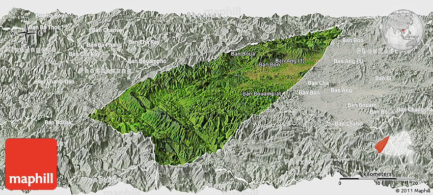 The panoramic satellite map represents one of several map types and styles available. Look at Pek, Xiangkhouang, Laos from different perspectives.