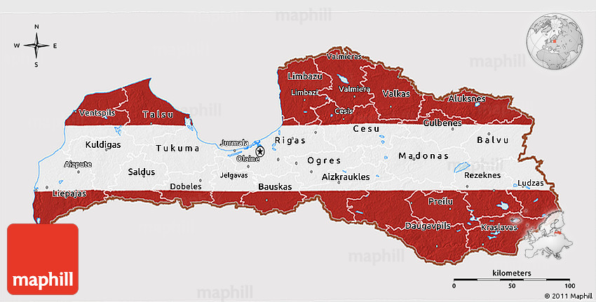 Flag map shows the flag of Latvia clipped inside the country's borders. Flag image is resized to match the width and height of the country's outline. Maphill flag maps are more precise than often used flag clip art illustrations.