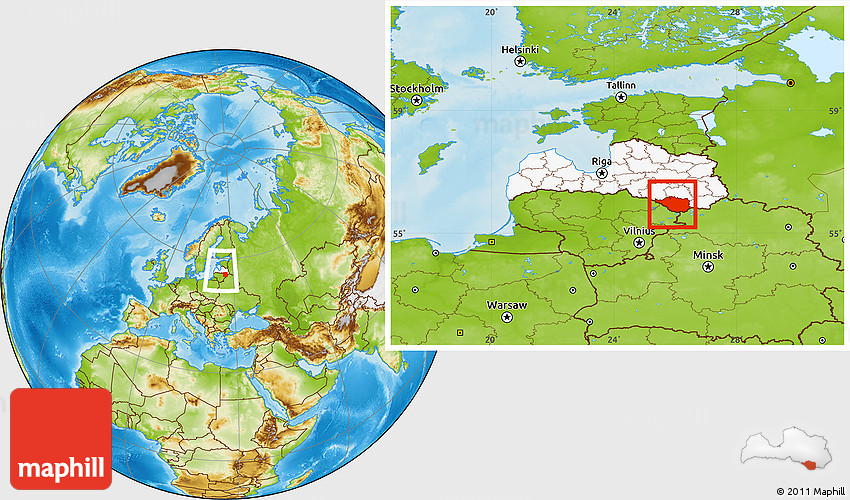 Maphill is a collection of map images. This image combines a physical map with the globe centered on Daugavpils. Use the buttons under the image to switch to different map types.