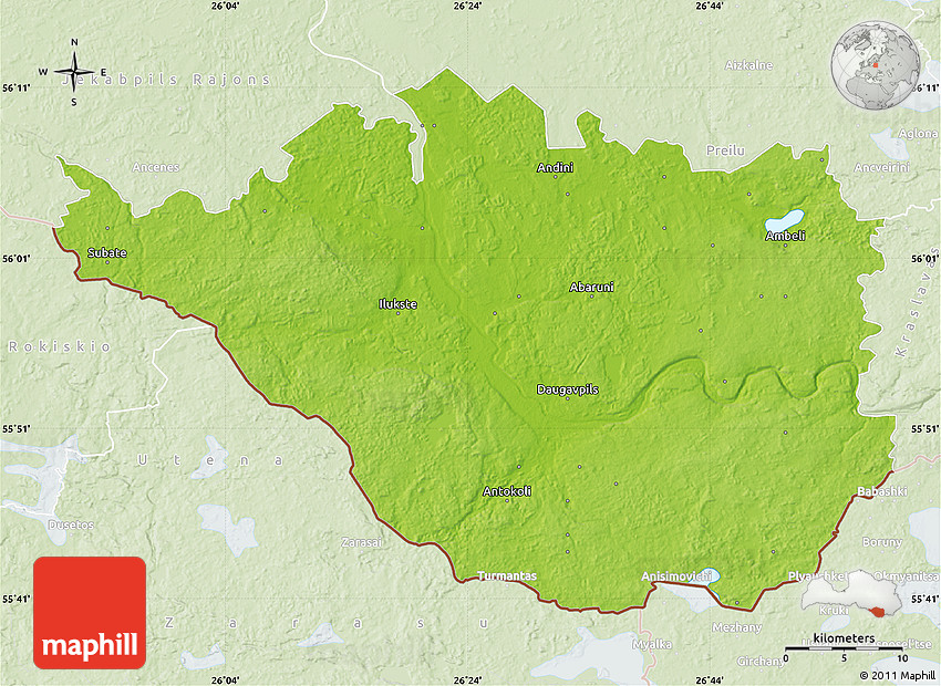 Physical map illustrates the mountains, lowlands, oceans, lakes and rivers and other physical landscape features of Daugavpils. Differences in land elevations relative to the sea level are represented by color.