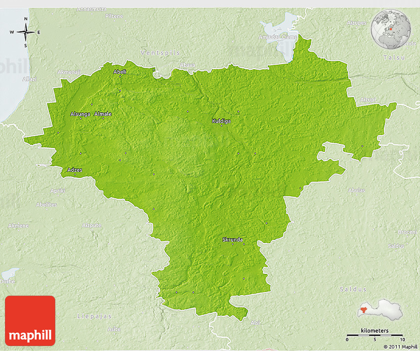 The 3D physical map represents one of many map types and styles available. Look at Kuldigas from different perspectives.