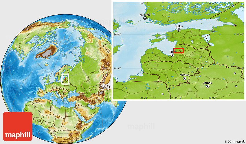 Maphill is a collection of map images. This image combines a physical map with the globe centered on Jumpravmuiža. Use the buttons under the image to switch to different map types.