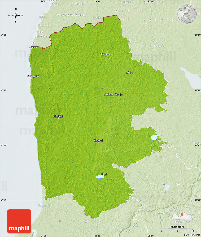 Physical map illustrates the mountains, lowlands, oceans, lakes and rivers and other physical landscape features of Limbazu. Differences in land elevations relative to the sea level are represented by color.