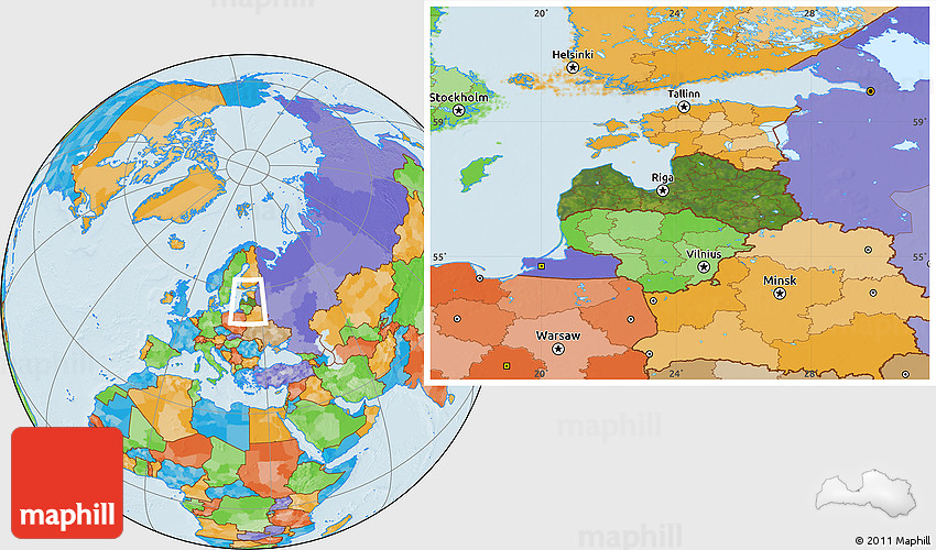 Maphill is a collection of map images. This image combines a satellite map with the globe centered on Latvia. Use the buttons under the image to switch to different map types.