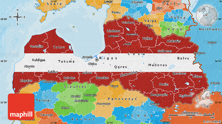 The value of Maphill lies in the possibility to look at the same area from several perspectives. Maphill presents the map of Latvia in a wide variety of map types and styles.