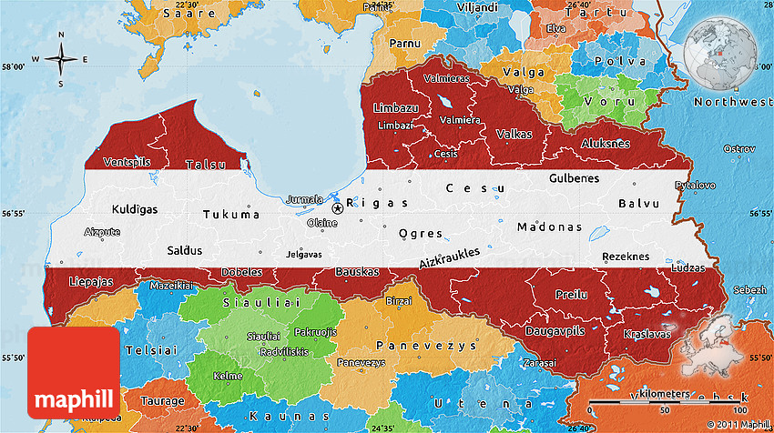 Maphill is a collection of map images. This flag map of Latvia is one of them. Click on the Detailed button under the image to switch to a more detailed map.