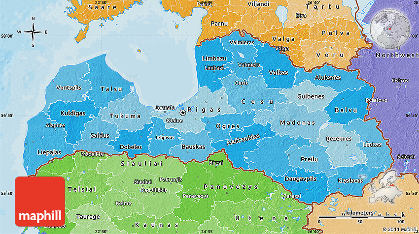 Maphill is a collection of map images. This political shades map of Latvia is one of them. Click on the Detailed button under the image to switch to a more detailed map.